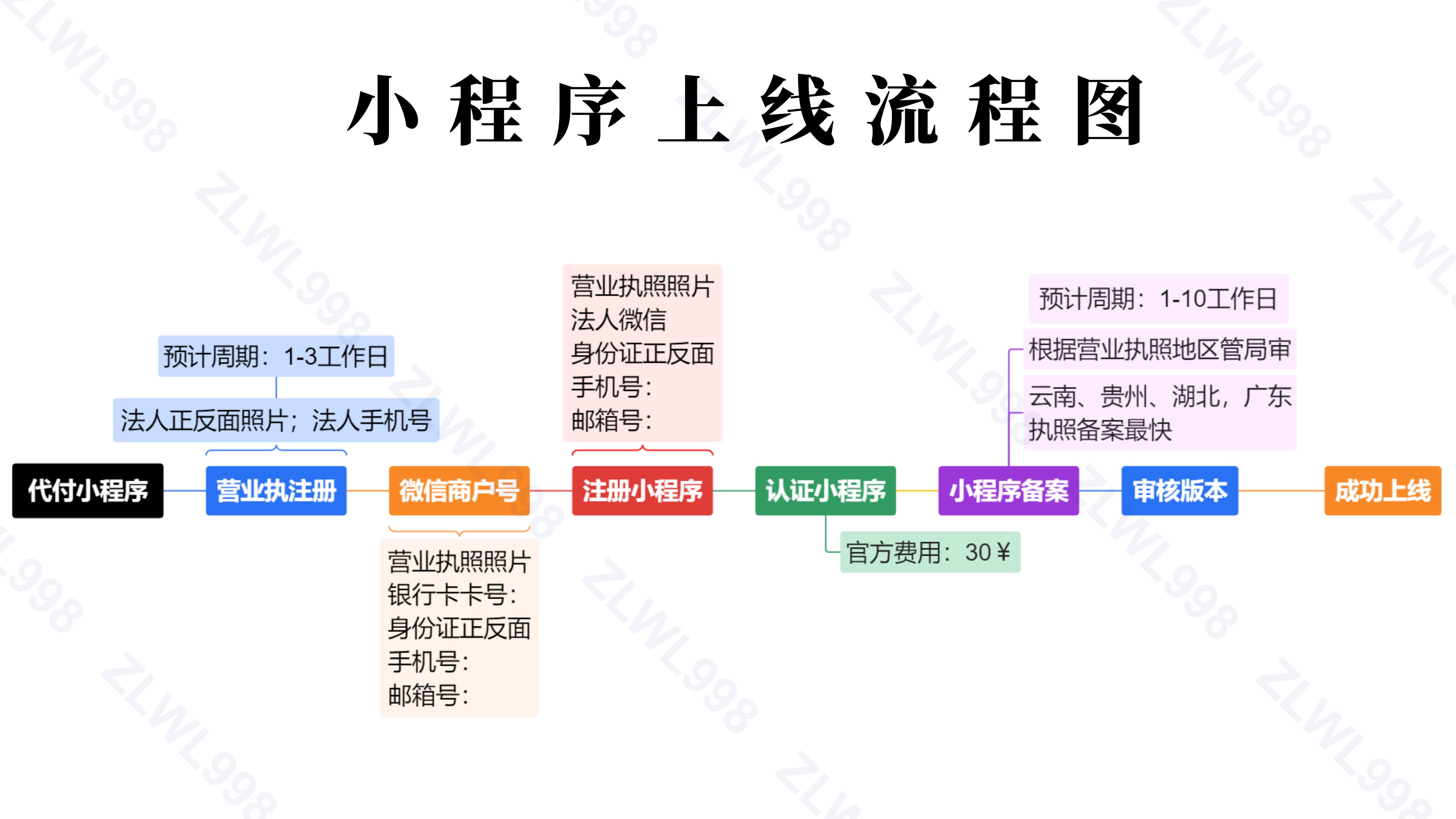 订单提交后,就开始注册认证小程序只需要当天配合好,后面就是等待小程序备案下来大概周期是:3-7个工作日左右 大概流程如下图